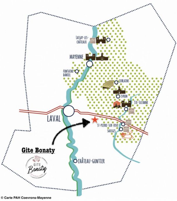 Entourée d'une zone boisée et bocagère notre meublé est située à 18 km de Laval (gare TGV), toute proche du Pays d'Art et d'Histoire Coëvrons-Mayenne (carte ci-contre) constitué par :