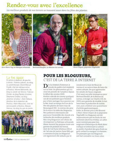 Lors de la fête des plantes de Saint Jean-de-Beauregard en juin 2017, La Maison du Sureau a été primé par le vote des blogueurs Rustica membres du jury.