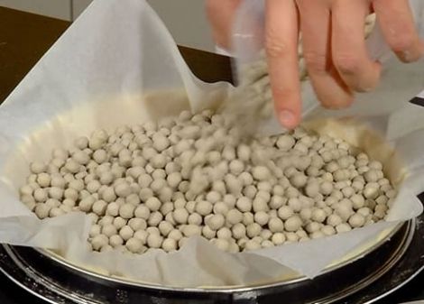 Mettre des poids au milieu (des légumineuses séchées) ou du gros sel pour éviter que le fond de la pâte ne soit difforme. (Voir Remarques ci-dessous)